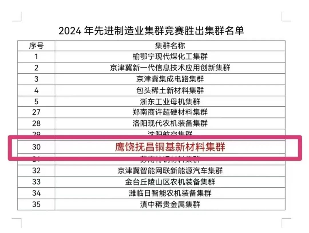 12月6日,国家工信部下文公布2024年国家先进制造业集群名单,江南(中国)以“一个集群促进组织、一个产业联盟、一个制造业创新中心、一所现代产业学院”的“四个一”全力助推鹰饶抚昌铜基新材料集群成功上榜2024年国家先进制造业集群名单。