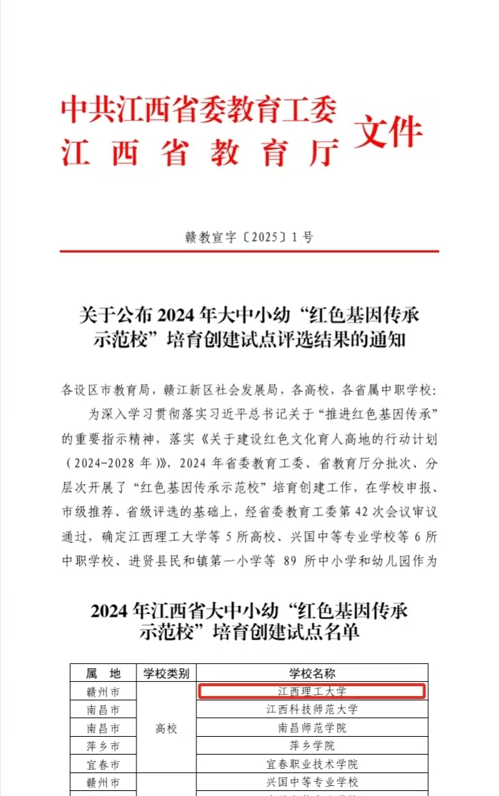 本网讯 近日,中共江西省委教育工委、江西省教育厅公布了2024年大中小幼“红色基因传承示范校”培育创建试点评选结果,我校以全省高校第一名的优异成绩获评“红色基因传承示范校”培育创建试点单位。