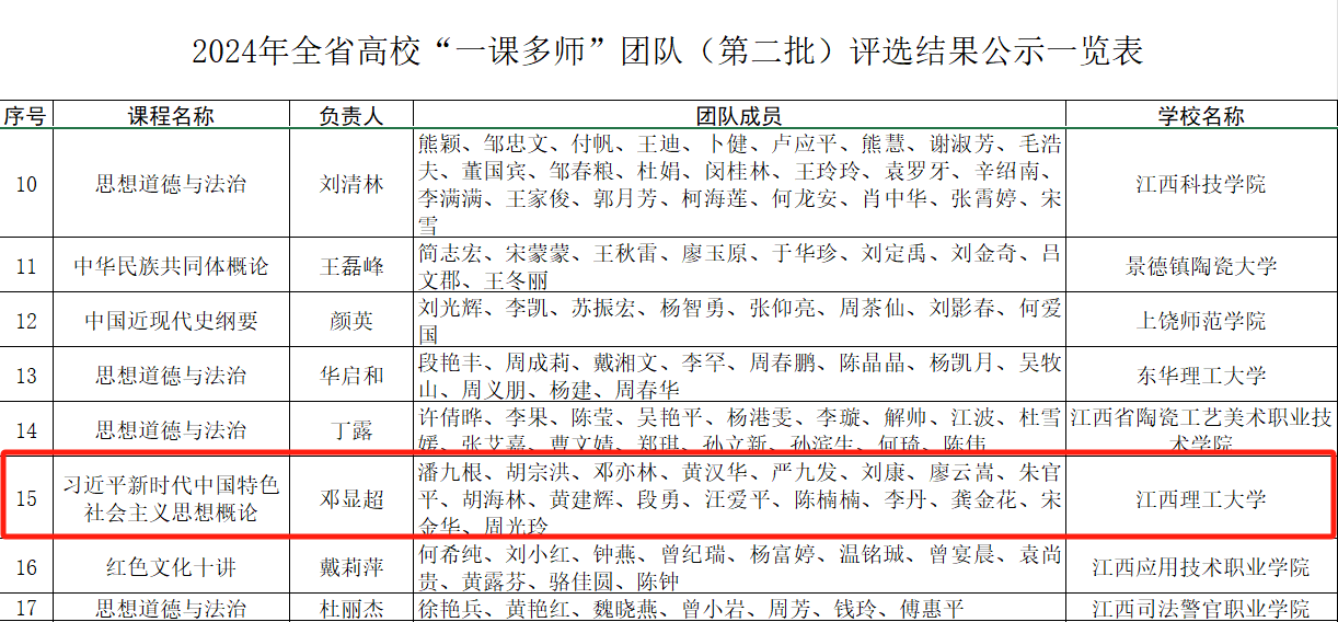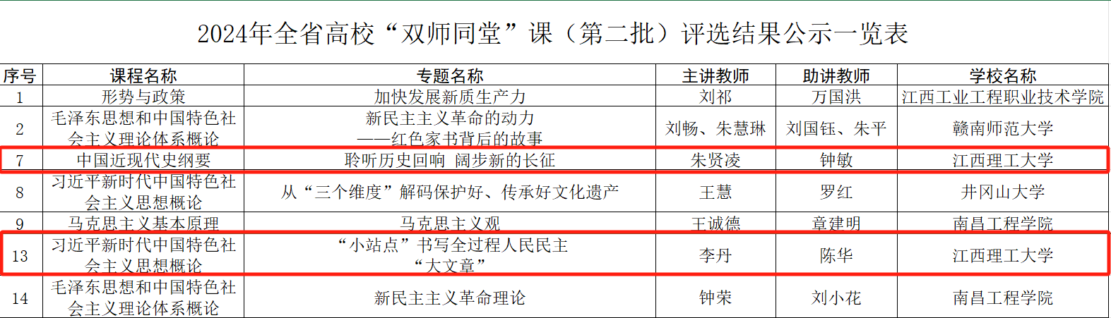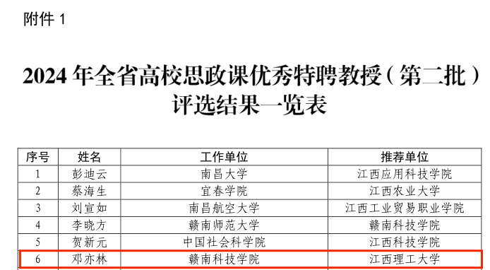 我校副校长黄志繁教授被评为“江西省高校思政课优秀兼职教师”;赣南科技学院邓亦林教授经我校推荐被评为“江西省高校思政课优秀特聘教授”;马克思主义学院邓显超教授申报的《习近平新时代中国特色社会主义思想概论》课程获批全省“一课多师”团队;龚金花老师申报的刘启耀纪念馆实践教学基地获批全省家门口的“大思政课”实践教学基地;朱贤凌老师和中央红军长征出发纪念馆钟敏老师主讲的《聆听历史回响 阔步新的长征》、李丹老师和章江街道人大工委主任陈华老师讲授的《“小站点”书写全过程人民民主“大文章”》获评全省高校“双师同堂”课;武立敬老师主讲的《建设社会主义生态文明》获评全省“师生同台”课;刘素兰老师申报的《怎样正确认识中华民族迎来了从站起来、富起来到强起来的伟大飞跃》获批全省“专题+艺术”特色思政课。