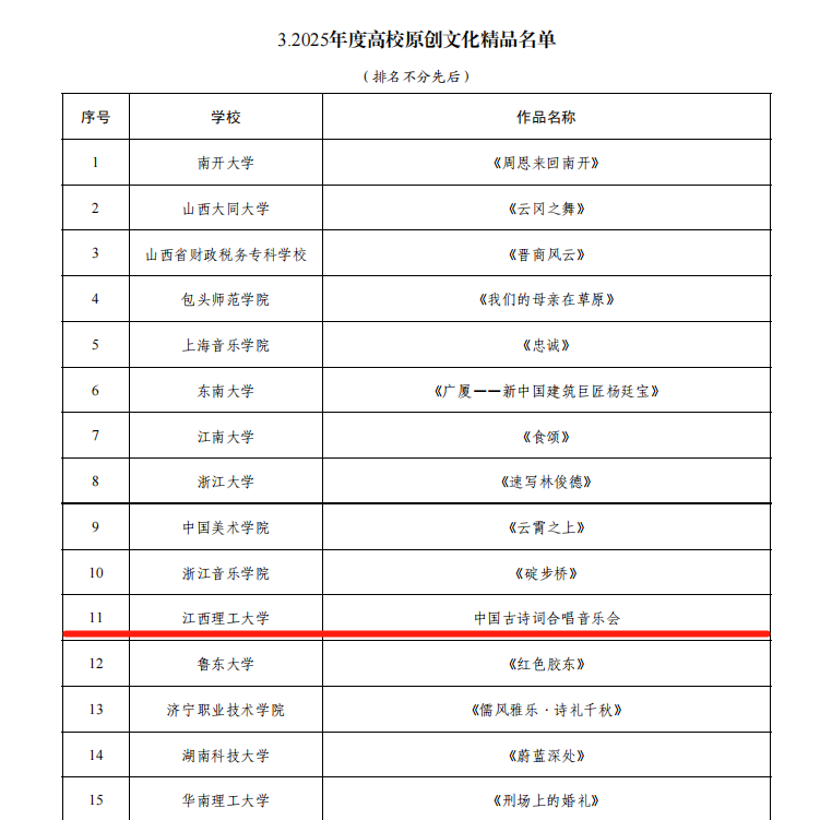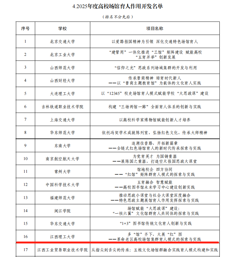 本网讯 近日,教育部公布了2025年度高校思想政治工作质量提升综合改革与精品建设项目遴选结果。我校共4个项目入选,其中,“中国古诗词合唱音乐会”项目入选2025年度高校原创文化精品,“多‘馆’齐下,大展‘红’图——革命老区高校场馆集群育人模式的探索与实践”入选2025年度高校场馆育人作用开发,“‘六位一体’体系下的心理育人新平台”入选2025年度高校学生心理健康教育指导典型案例,“世界首条稀土永磁磁浮轨道‘红轨’融入高校思想政治教育典型案例”入选2025年度新时代伟大变革融入高校思想政治教育典型案例,入选总数并列全省第一。