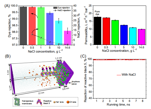 图3:亚4纳米多孔膜在不同盐度活性黑5/NaCl混合溶液的过滤性能