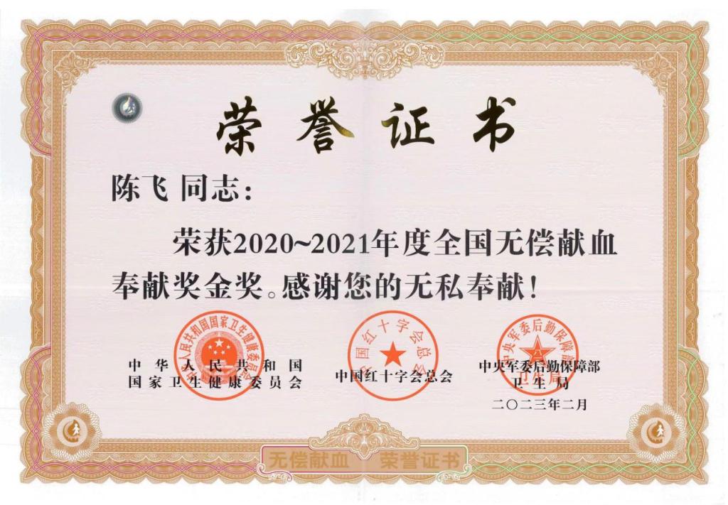 据悉,该荣誉是对2020至2021年度在无偿献血事业中做出显著成绩和贡献的献血者予以的表彰奖励,分为铜奖、银奖、金奖和终身荣誉奖,其中,全国无偿献血奉献奖金奖由献血40次及以上者获得。